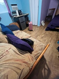 The property was in poor condition with peeling paint no door frames and dirty stairwell. The room itself was very small for three people. Once we had the single Murphy bed and double sofa bed pulled out there was no more than 6 inches to get around anywhere. It should never have been advertised for three people. I believe it should’ve been for a single person with the Murphy bed only. My husband and I both had back aches for days after sleeping on the pullout sofa bed. We were supposed to stay for two nights and left after the first night and found a different room somewhere else that was much more comfortable. The area around the property seemed a bit seedy. Definitely not someplace that older people would feel comfortable. Maybe more for young backpackers